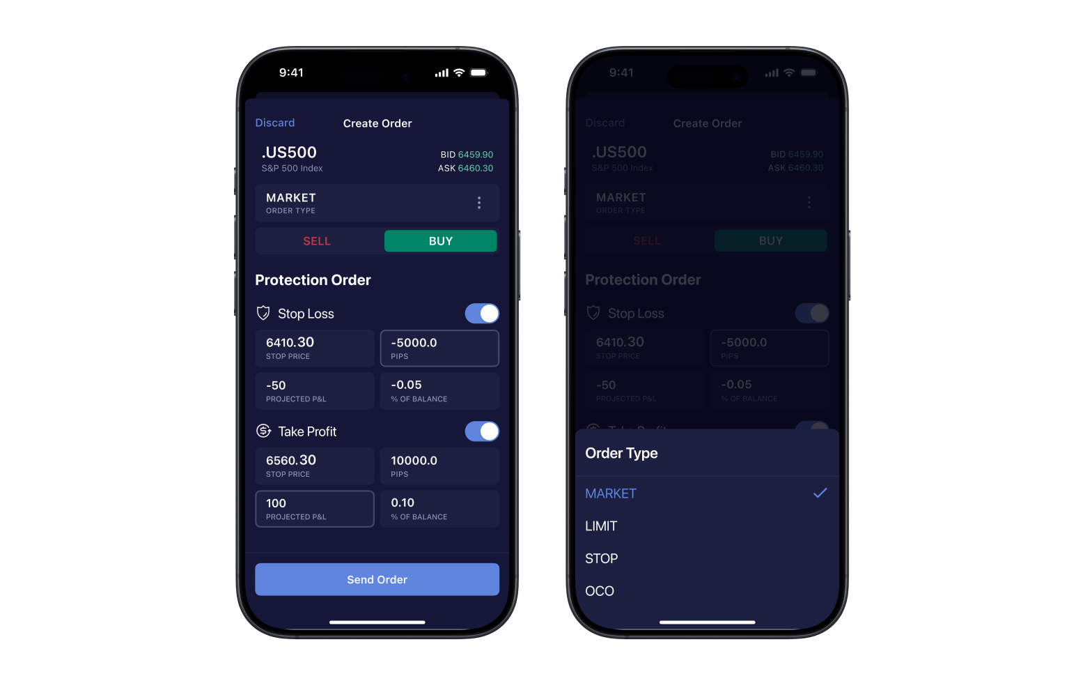 A range of order types available within the apps includes market, stop, limit, and OCO orders with an option of attaching a Stop Loss or Take Profit to any position or pending order.