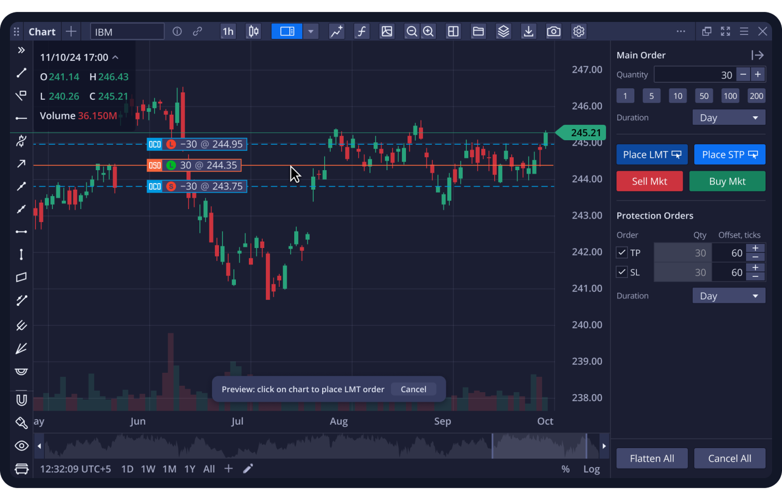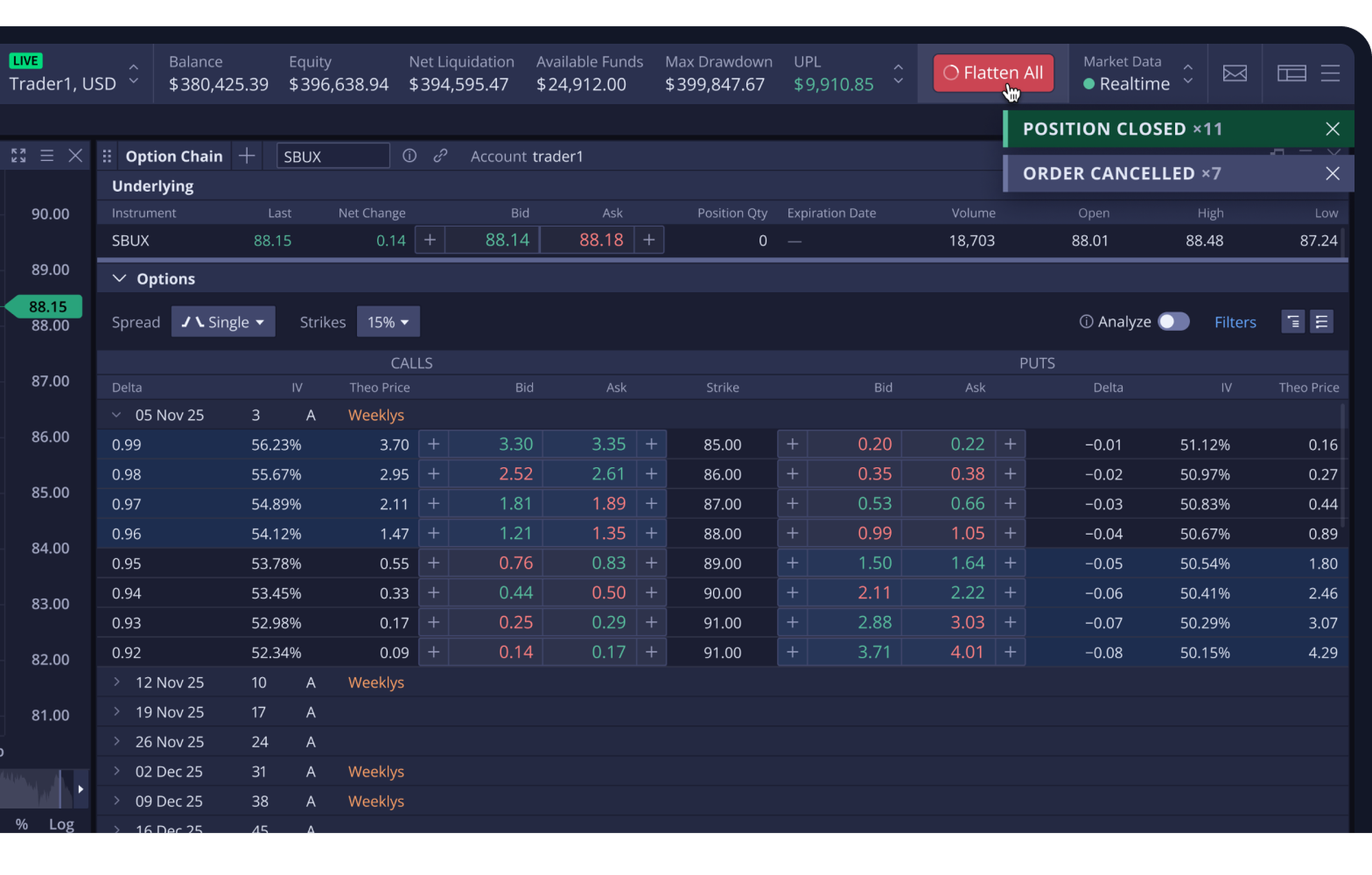 The Flatten All feature lets traders cancel all working orders and close all open positions in selected accounts with a single click, automatically detecting options strategies and closing them via appropriate multi-leg orders.