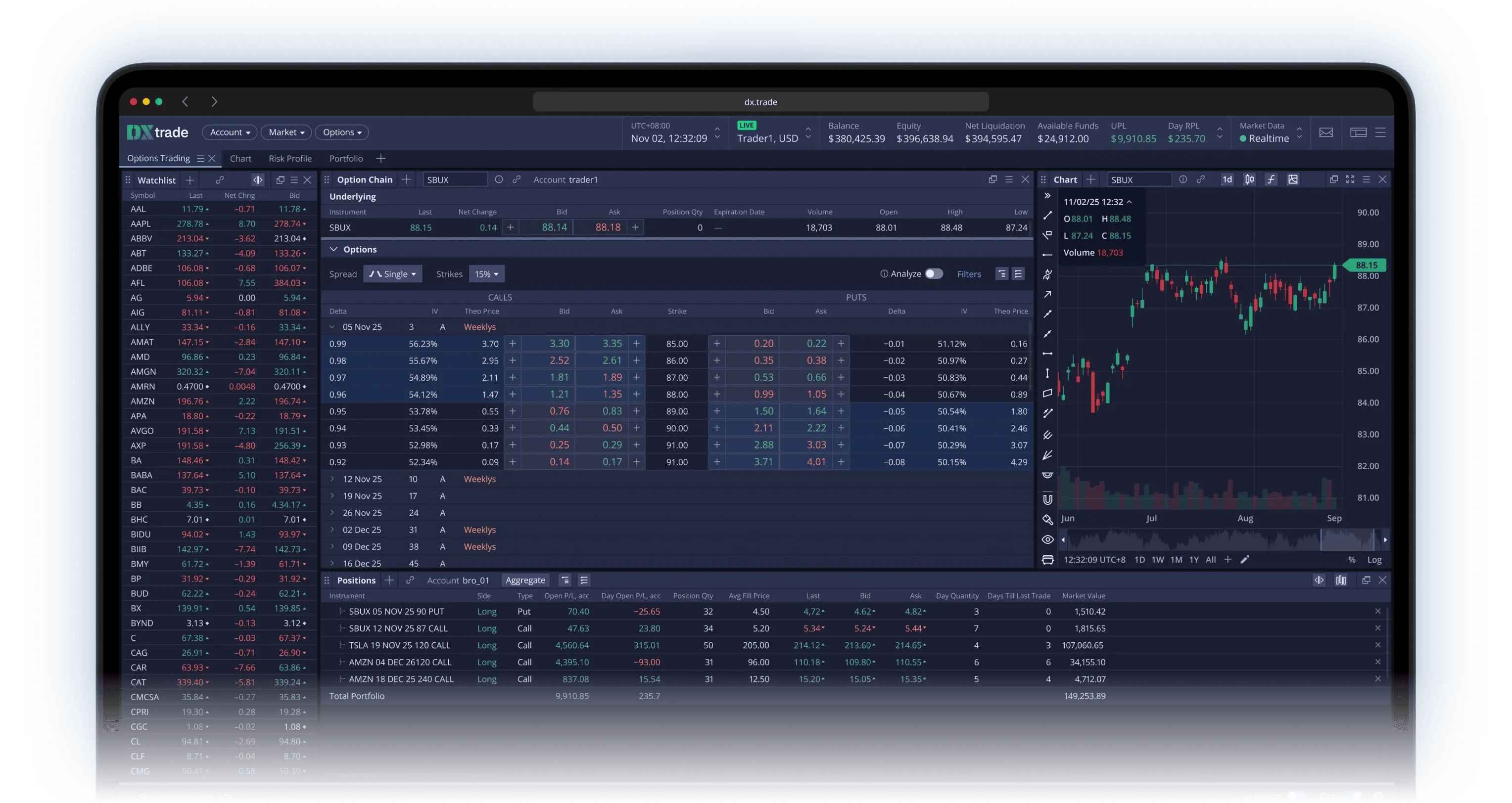 DXtrade’s options UI gives your clients the tools to analyze markets, build strategies, and enter positions.