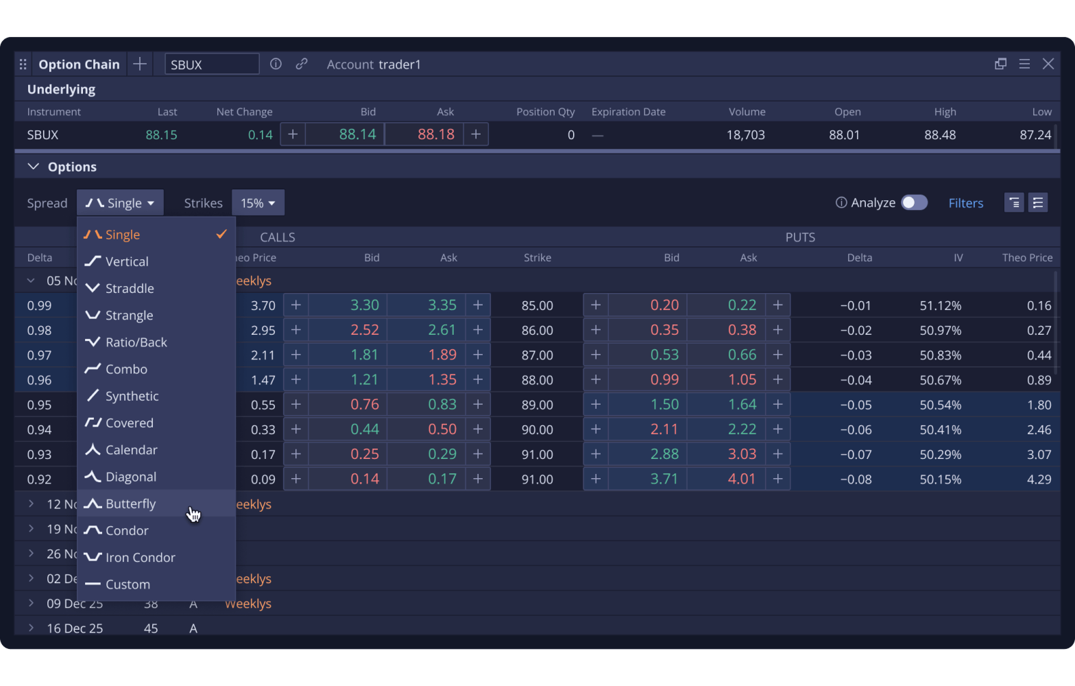 Select from a list of popular options strategies, including straddles and butterfly spreads.